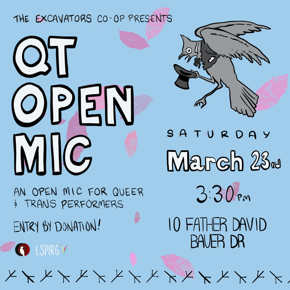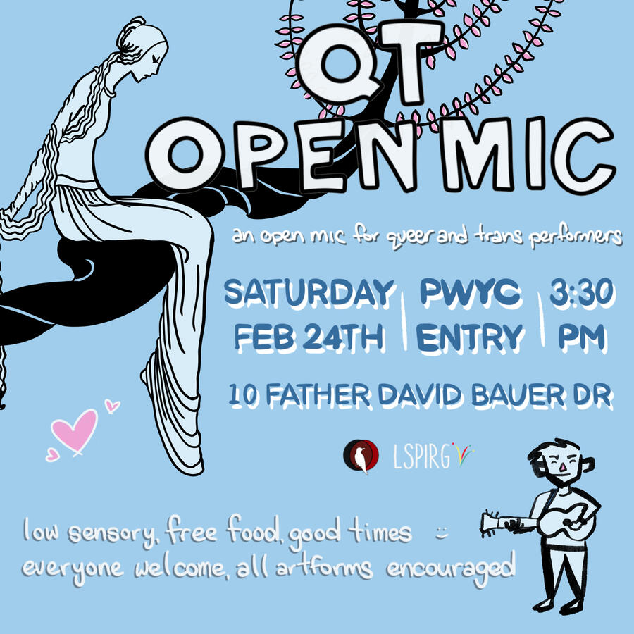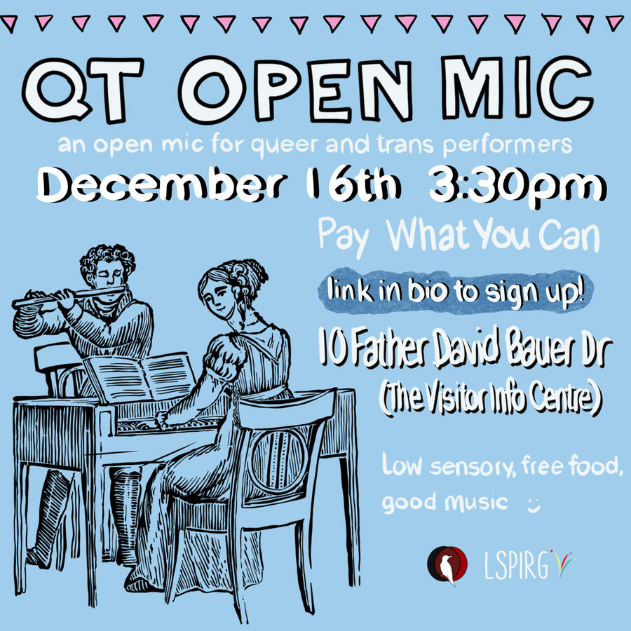 We are very thankful to be supported and sponsored by Laurier Students' Public Interest Research Group as one of their Research and Action Groups. LSPIRG's work involves community care, mutual aid, political education, and activism by and for people in the Waterloo and Brantford Regions.Fun Fact: Our very first QT Open Mic back in 2019 was hosted and sponsored by LSPIRG!